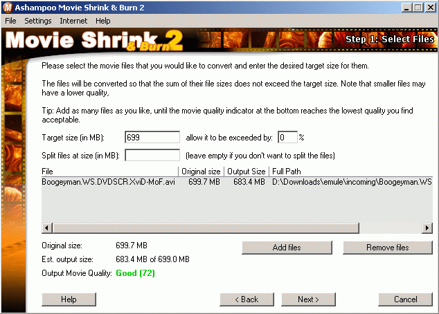 Po wybraniu filmu zostanie wyświetlona jego nazwa i rozmiar jaki zajmuje. Tutaj w polu Target size (in MB) musimy wpisać jak najbardziej zbliżony rozmiar pliku wynikowego do pliku oryginalnego. Przykładowo mamy Original size = 699,7MB to wpisujemy w polu Target size 699MB. Jeżeli wpiszemy tą samą wartość to program nam z filmem nic nie zrobi.